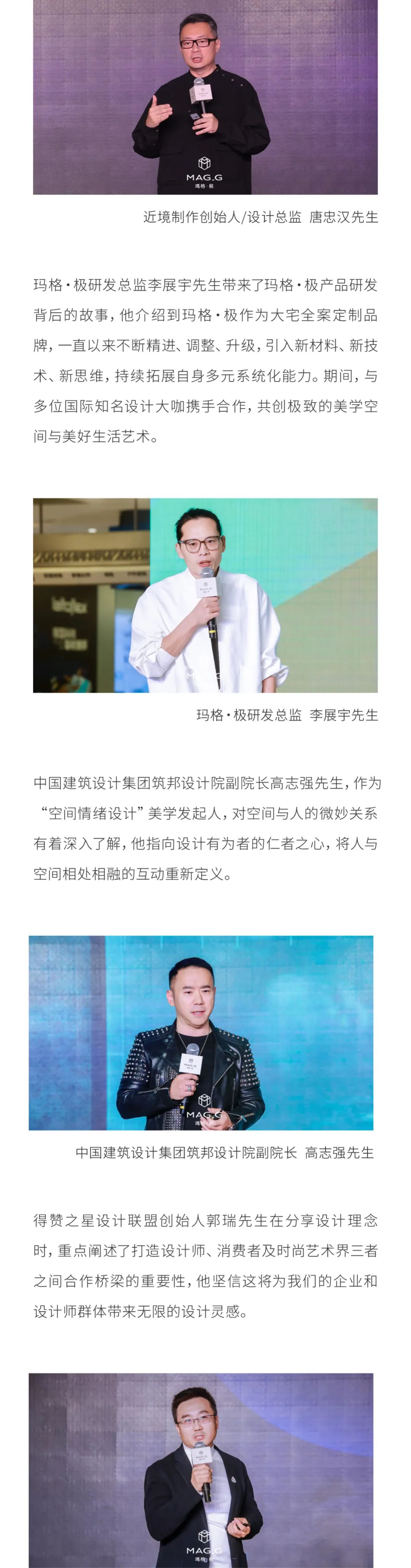 極物設計創(chuàng)始人/瑪格·極G系列聯(lián)名設計師姚君先生,在講述與瑪格·極合作過程中,瑪格·極誕生即謀定遠見,以設計為名共探極致造物精神,全面賦能設計師的創(chuàng)意設計落地,與瑪格·極合作中,瑪格·極大宅全案定制交付力,給到了我們150%的驚喜!其不單單是追求美學和工藝技術(shù),更多還有個性化定制,藝術(shù)與科技多元融合,將不止美好的極致生活藝術(shù)融入空間。